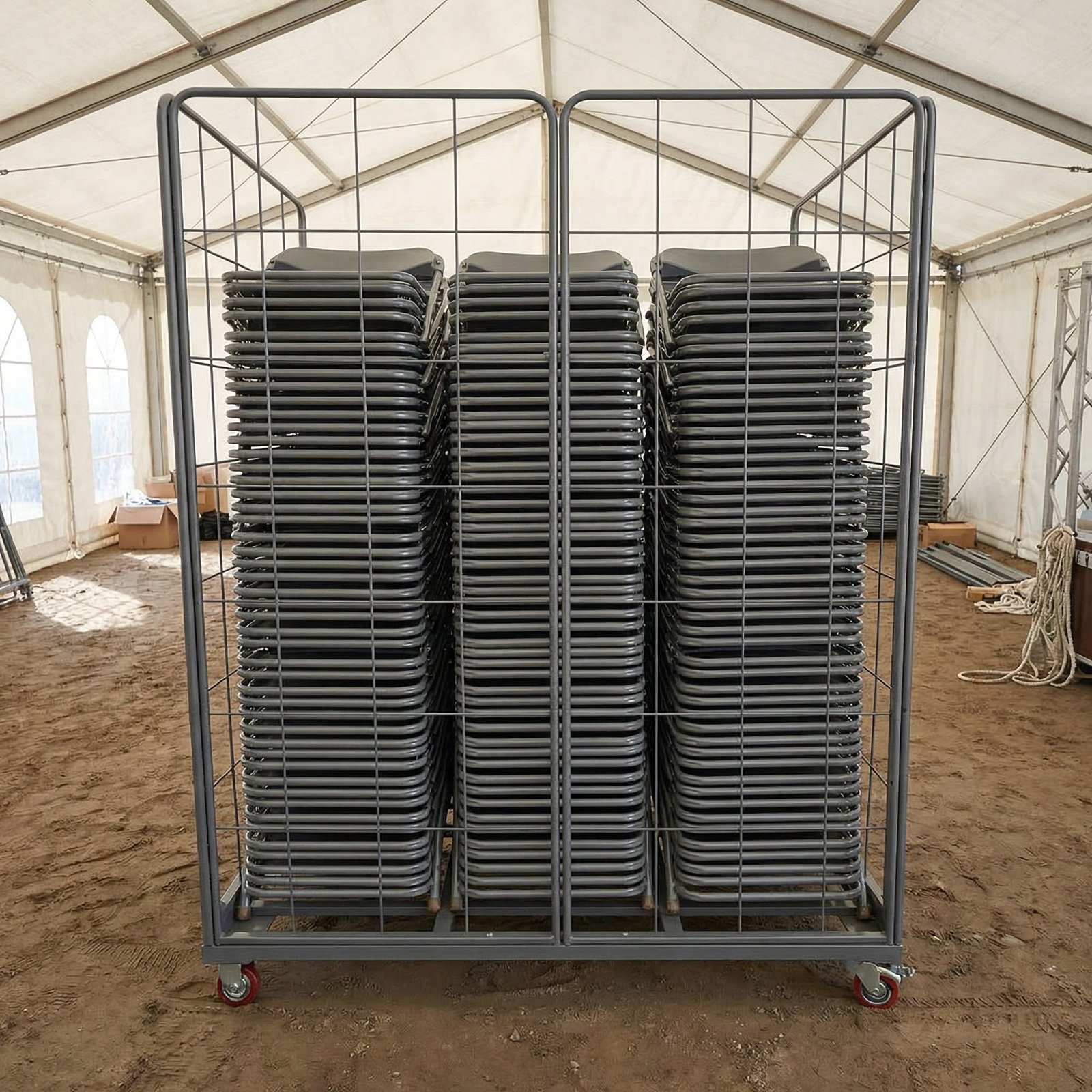 Fabricado en estructura metálica de alta resistencia, está diseñado para soportar un uso intensivo, facilitando el movimiento de grandes cantidades de mobiliario de forma cómoda y segura. Su capacidad para entre 90 y 100 sillas lo convierte en una herramienta imprescindible para hostelería, eventos, almacenes y colectividades.