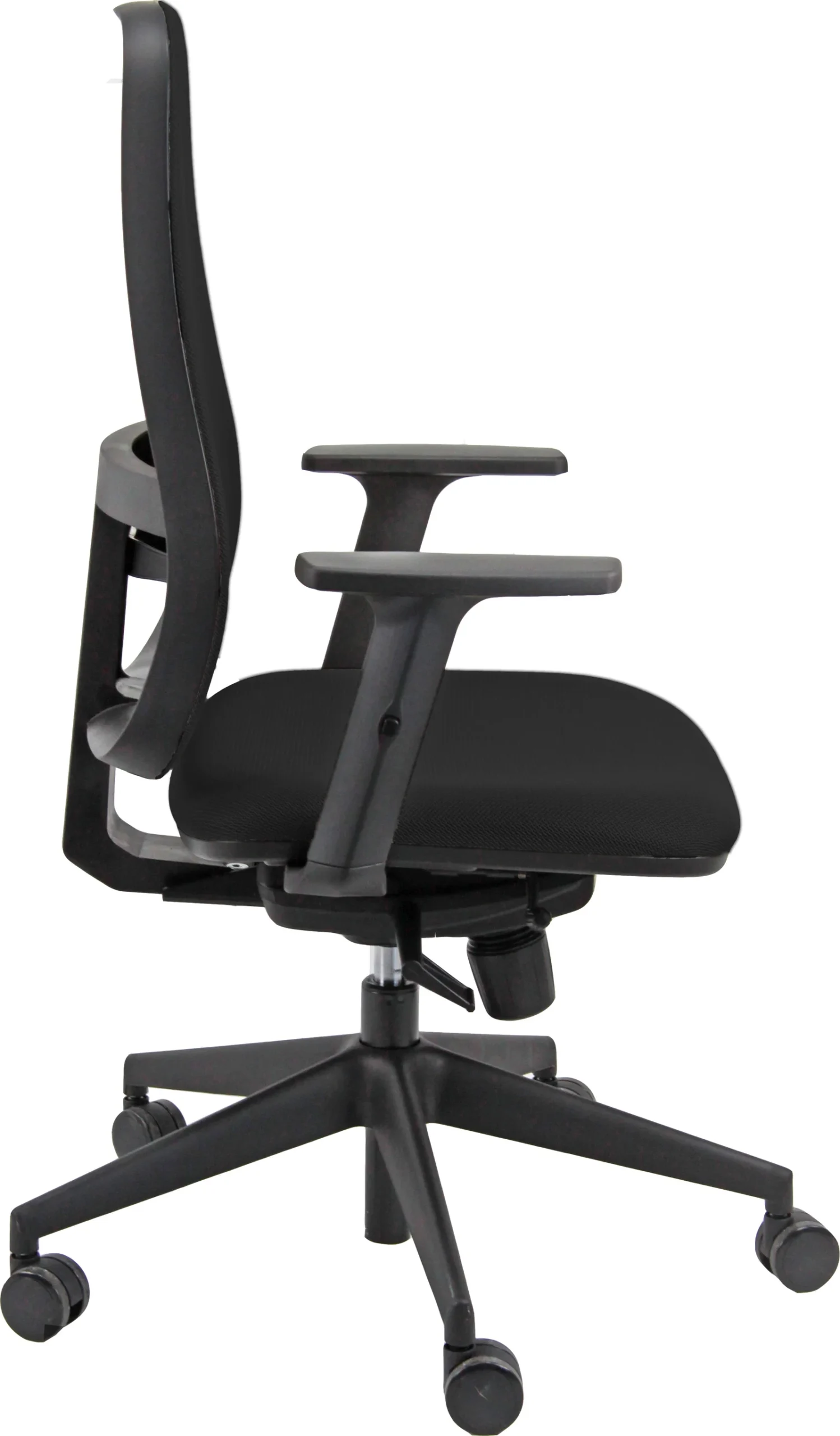 La silla BLAZE negra, diseñada para entornos operativos, incorpora mecanismos que garantizan comodidad y funcionalidad. Está equipada con un sistema de elevación por pistón de gas certificado por TÜV, que permite un ajuste suave y seguro de la altura. Su mecanismo de inclinación sincronizada coordina el movimiento del respaldo de malla y el asiento, ofreciendo un balanceo controlado para posturas dinámicas. Además, incluye un sistema de contacto permanente del respaldo para un soporte continuo, complementado por reposabrazos ajustables que optimizan la ergonomía durante el trabajo.