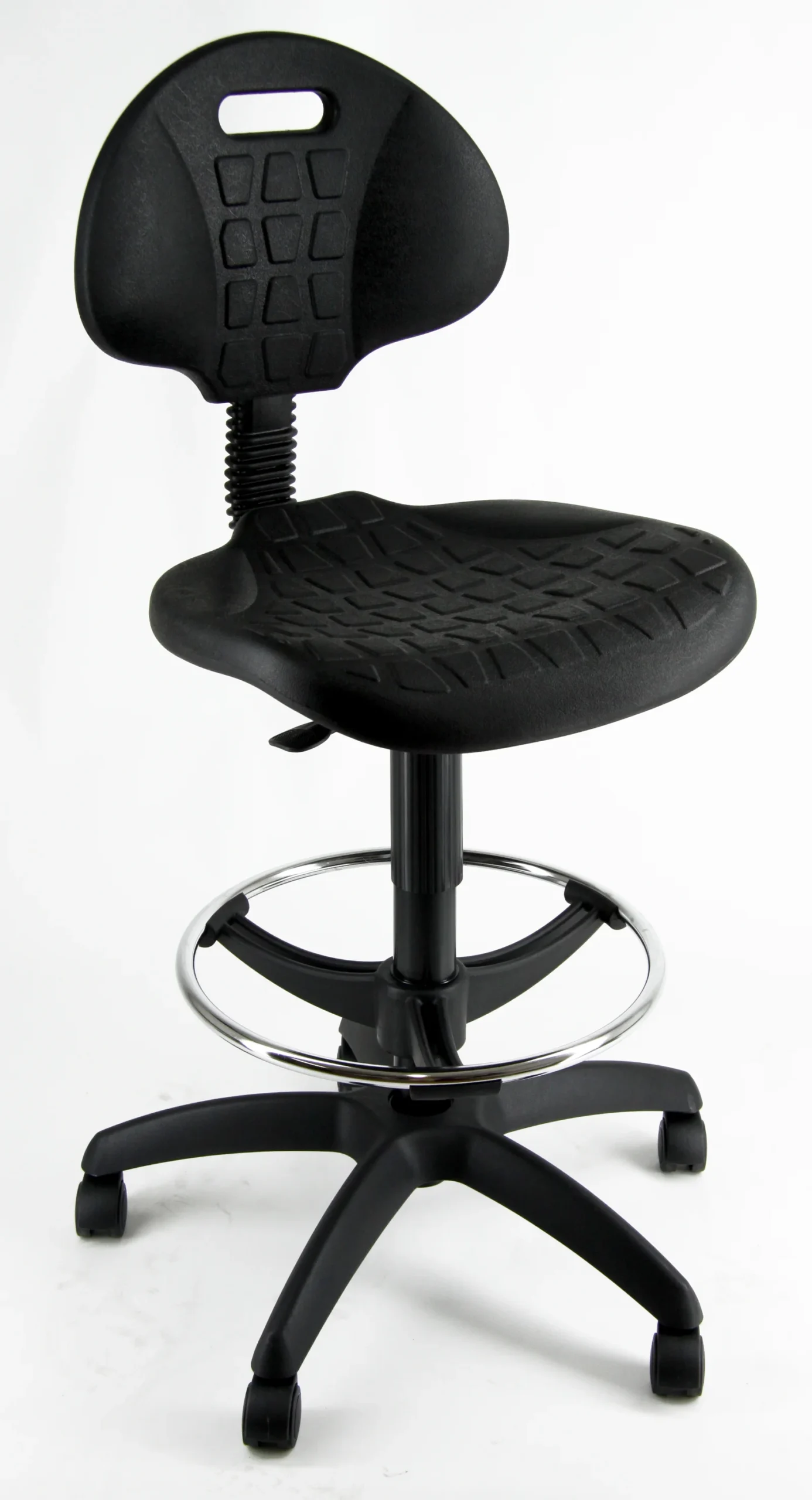 El taburete técnico EOE2 está diseñado para entornos especializados, integrando mecanismos que combinan movilidad y ergonomía. Cuenta con un sistema de regulación de altura mediante pistón de gas para un ajuste preciso. El respaldo ajustable en altura y profundidad permite personalizar el soporte, mientras que la base giratoria con ruedas ofrece una rotación fluida de 360 grados. Un aro reposapiés añade comodidad para trabajos técnicos prolongados.